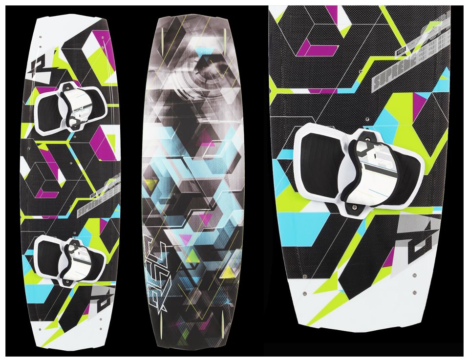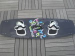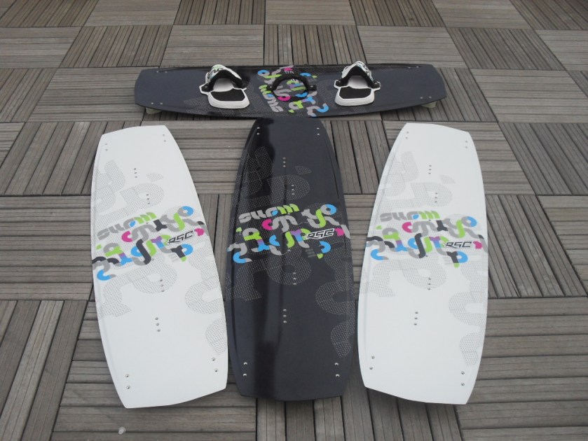 A ma gauche, la RSC Play, 5’2 par 18 shapée pour coller à la nouvelle tendance freestyle wave new school les pieds à l’air. Très compacte avec un nose tronqué, c’est une planche qui vous permettra d’enchainer des tricks facilement et radicalement en strapless. Malgré sa petite taille, elle conserve suffisamment de volume grâce à un nez et un tail bien large et une surface importante qui vous plaquera la planche aux pieds pour les phases aériennes. Son rocker assez rendu associé à un double concave assure vitesse, confort et turns radicaux dans les petites vagues. Rapide, confortable, pivotante, c’est un jouet très performant pour tout type de plan d’eau.